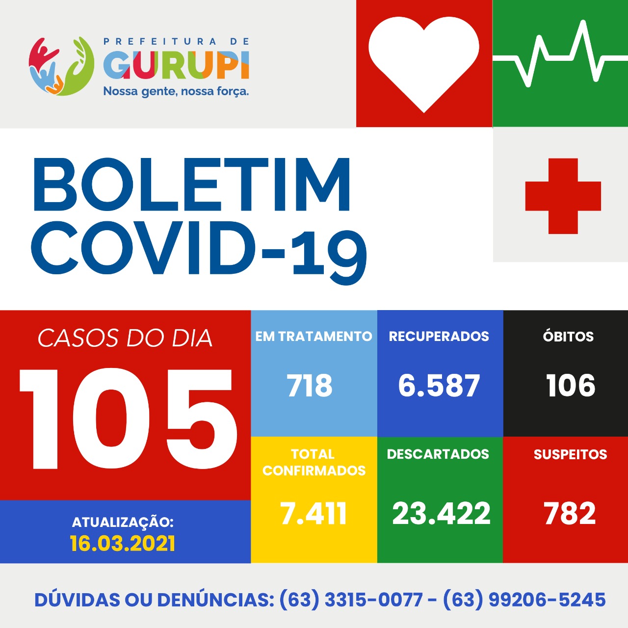 Gurupi contabiliza nesta terça-feira 23.422 casos descartados; 782 casos suspeitos; 7.411 confirmados, destes: 6.587 (88,9%) pessoas estão recuperadas, 718 (9,7%) estão em tratamento, e 106 (1,4%) óbitos.