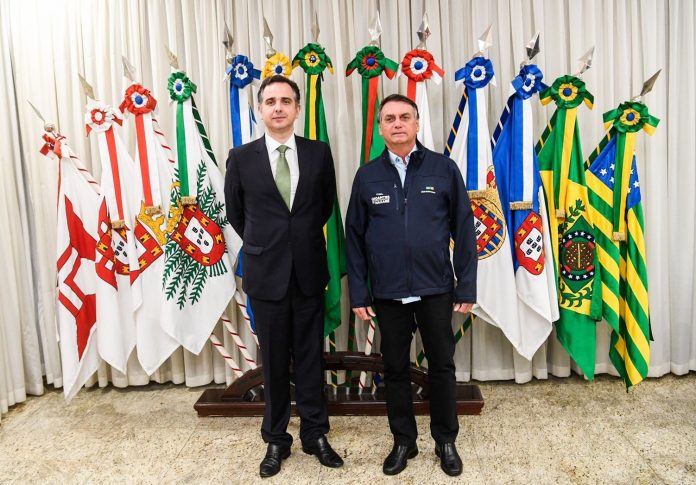 O presidente do Senado, Rodrigo Pacheco, e o presidente da República, Jair Bolsonaro, em transmissão de cargo na Base Aérea de Brasília