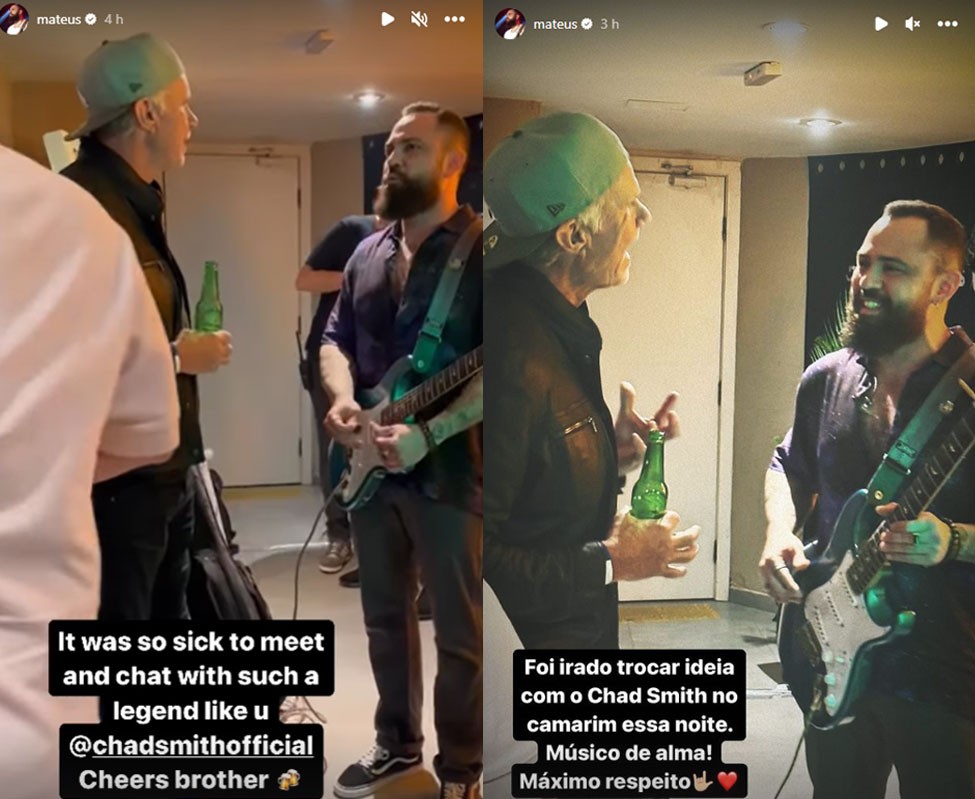 “Foi irado trocar ideia com o Chad Smith no camarim essa noite. Músico de alma. Máximo respeito”, escreveu Mateus em suas redes sociais.