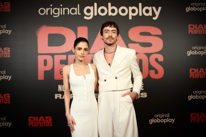 Os atores Julia Dalavia e Jaffar Bambirra em evento de estreia da série ‘Dias Perfeitos’, na qual fazem os papéis de Clarice e Teo