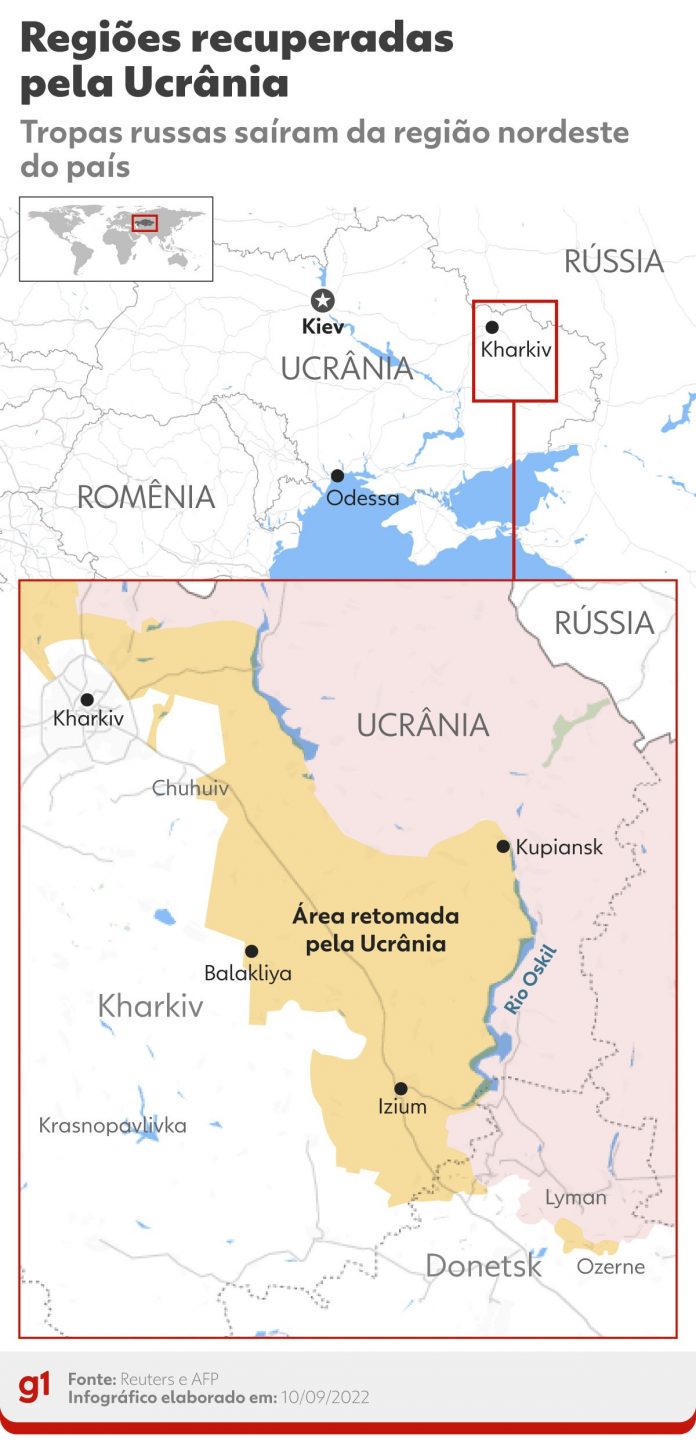 Na última semana, a Ucrânia conseguiu retomar partes importantes de seu território que haviam sido ocupados por tropas de Moscou, e, por isso, os ucranianos estão com moral em alta, e os russos, em baixa. Na Rússia, onde tradicionalmente não se critica Vladimir Putin publicamente, alguns aliados e especialistas em temas militares verbalizaram seu descontentamento com o líder.