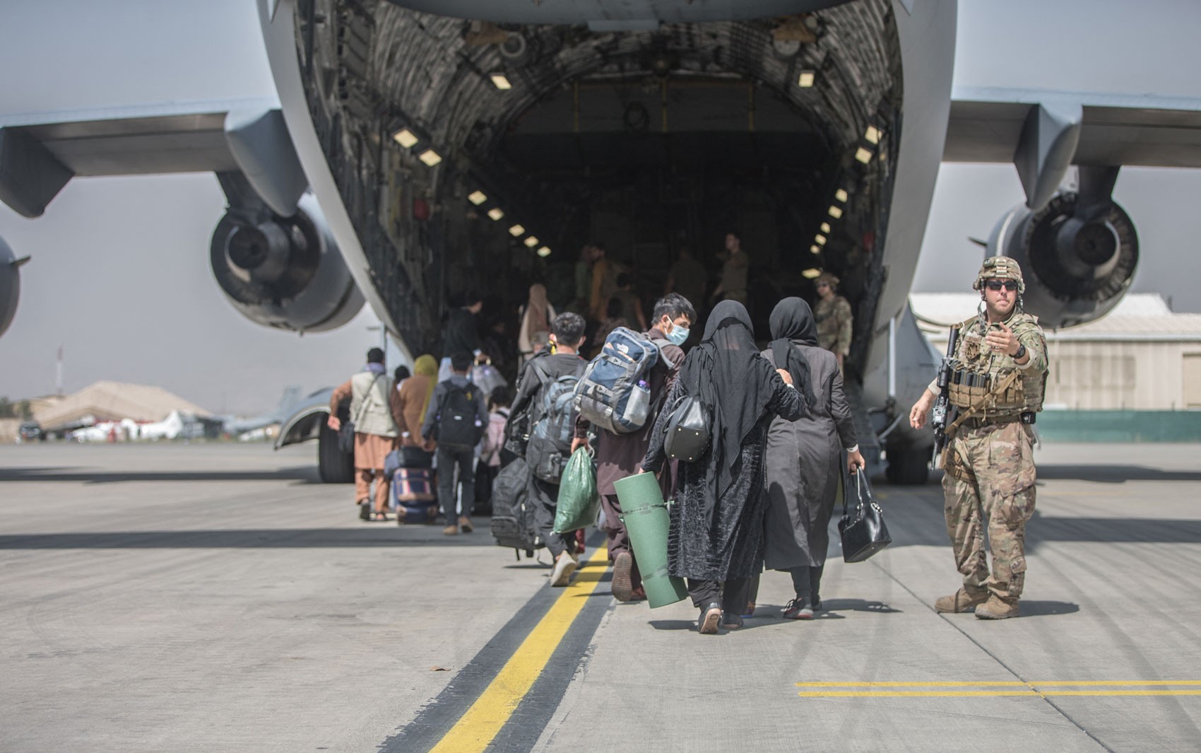 Pela primeira vez desde 2001, não há tropas americanas no país. Mas o fim do envolvimento militar dos EUA no Afeganistão levanta um novo conjunto de questões para Joe Biden e seu governo. Famílias afegãs embarcam em Boeing C-17 da Força Aerea dos EUA no aeroporto internacional Hamid Karzai, em Cabul, no Afeganistão, em 23 de agosto