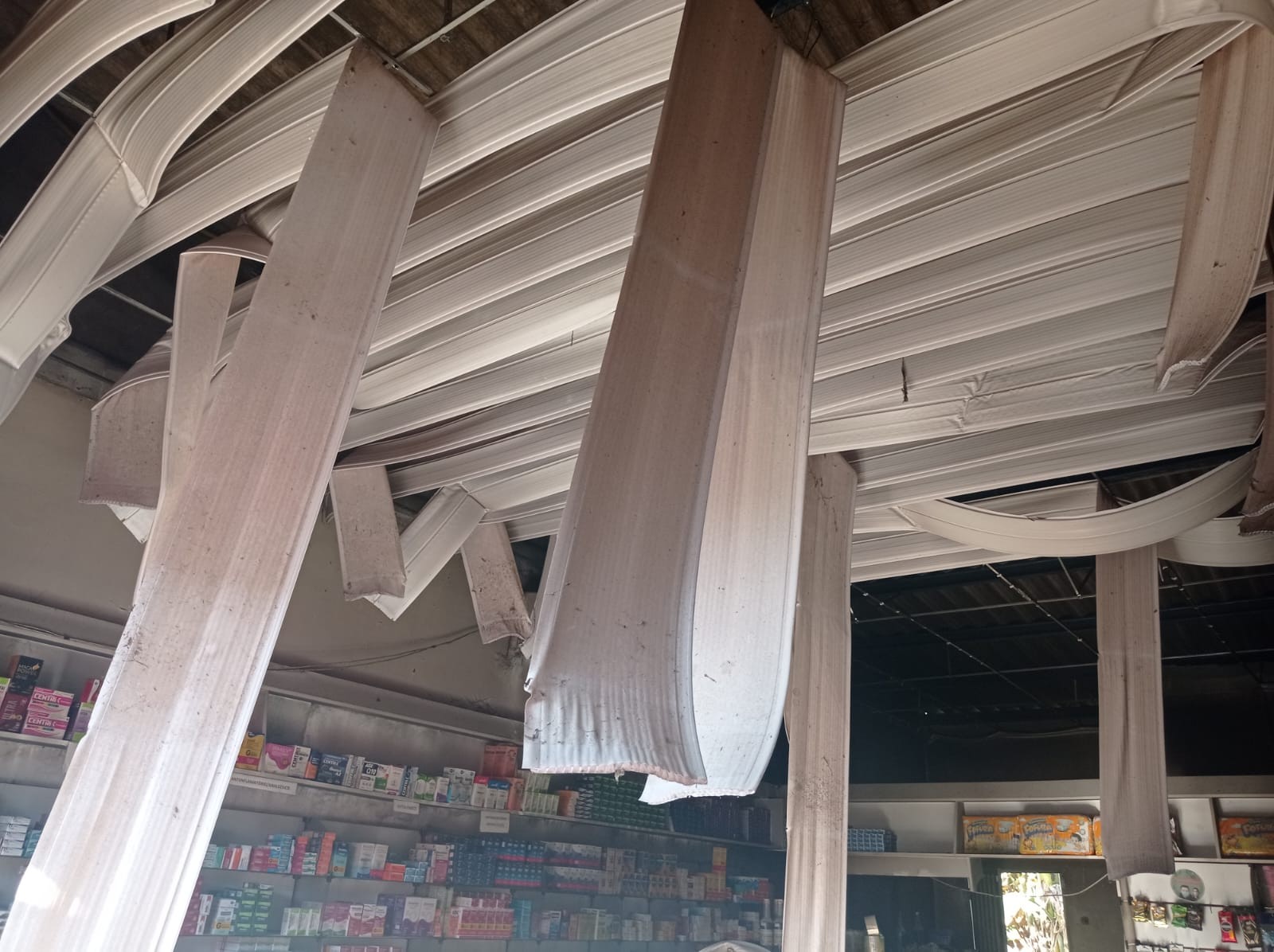 Farmácia pega fogo e parte do teto desaba antes da loja abrir
