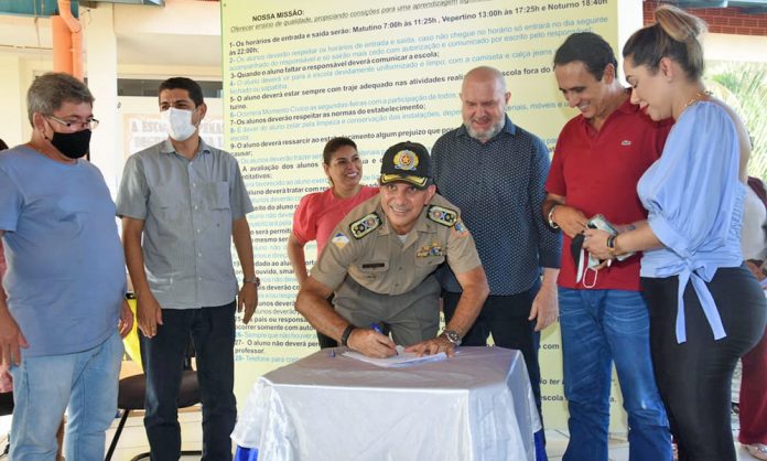 O governador Mauro Carlesse assinou, na tarde desta quarta-feira, 11, o termo de cooperação para instituir a metodologia na antiga Escola Estadual Joca Costa, junto a titular da Secretaria de Estado da Educação, Juventude e Esportes (Seduc), professora Adriana Aguiar, e o comandante geral da Polícia Militar (PM), coronel Jaizon Veras.