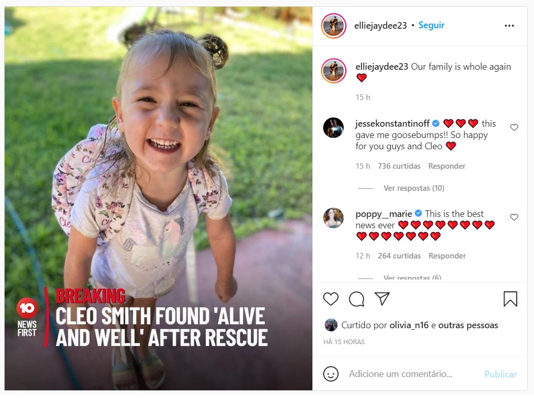 A publicação em uma rede social foi feita horas após a pequena Cleo, de 4 anos, ser resgatada em uma casa em Carnarvon, no estado da Austrália Ocidental, a cerca de 100 km de onde desapareceu.