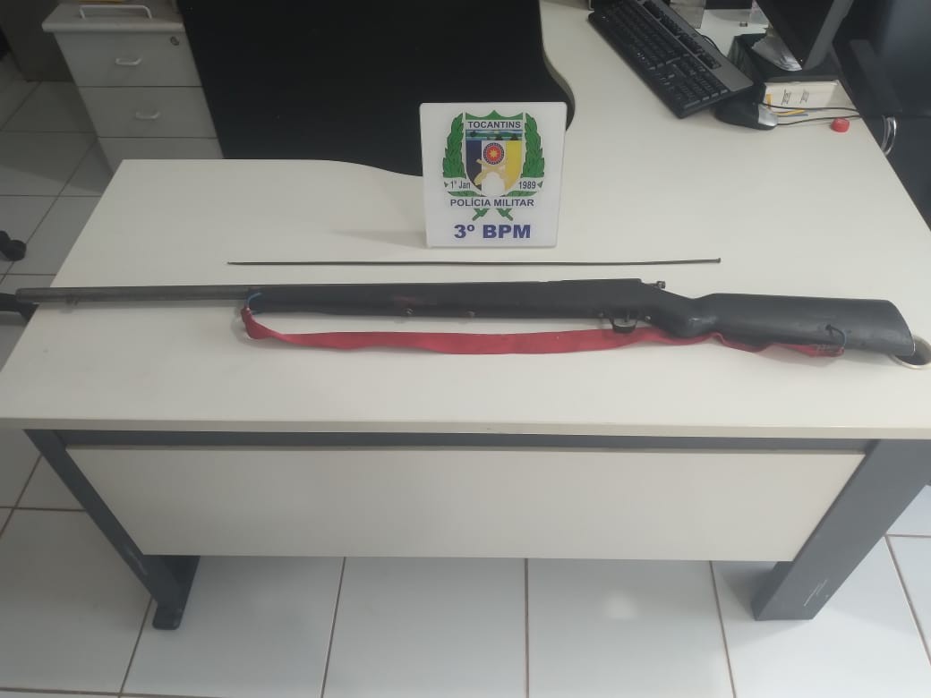 Arma foi encontrada embaixo do colchão de um colchão na casa do casal. Suspeito foi levado à delegacia de Pedro Afonso. Espingarda estava escondida debaixo de colchão