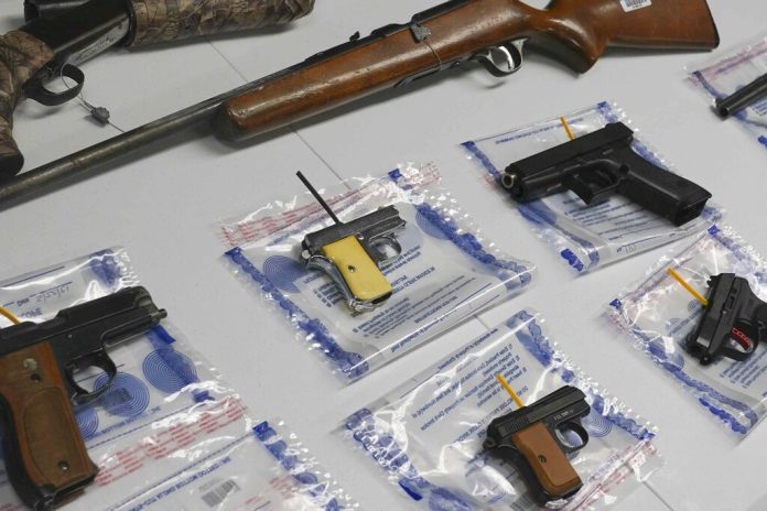 Estudo revelou que número de mortes entre as mulheres vem crescendo mais rápido do que entre os homens. Uma coleção de armas ilegais é exibida durante um evento de recompra de armas, maio de 2021, Nova York, EUA