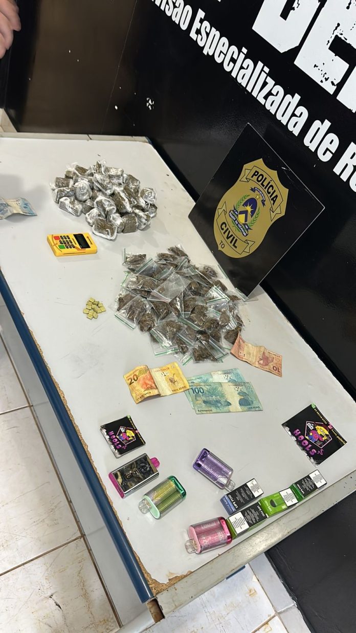 A polícia ainda informou que o suspeito costumava comercializar as drogas na região da Praça dos Girassóis e do Parque dos Povos Indígenas. Foram encontrados com o motorista maconha, skank, que é variação mais forte de maconha, comprimidos de ecstasy e cigarros eletrônicos contrabandeados do Paraguai.