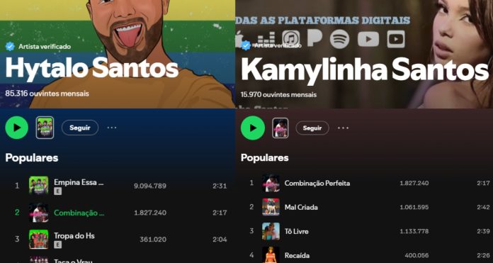 O perfil de Kamylinha também segue com as músicas no ar. Tanto as faixas dela, quanto as de Hytalo, constam como produzidas, editadas e lançadas pela “Hytalo Santos Music”.