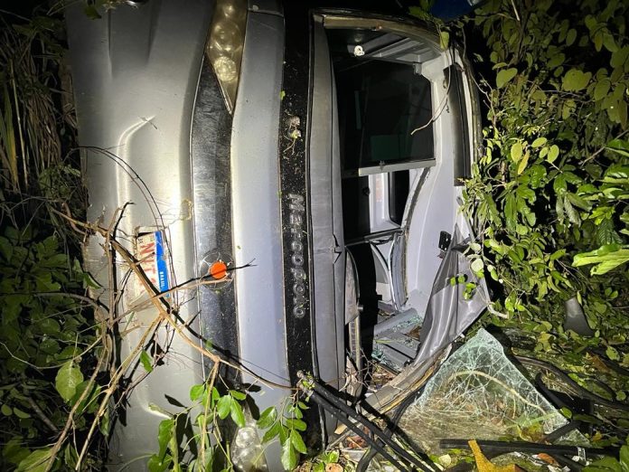 Imagens feitas pelo Corpo de Bombeiros mostram o ônibus tombado em uma área de mata. O acidente aconteceu por volta das 23h desta segunda-feira (18). O veículo transportava 44 pessoas entre jovens e adultos, além de mais cinco crianças.
