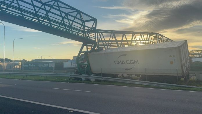 Passarela na BR-153 ficou danificada após ser atingida por caminhão