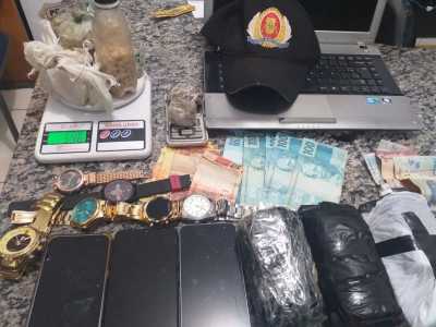 Os policiais apreenderam também, produtos de origem duvidosa, sendo um notebook, três celulares, cinco relógios, uma bicicleta, uma balança de precisão, e ainda três embalagens plásticas, de cor preta.
