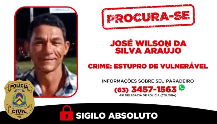 A Polícia Civil divulgou um cartaz de procurado contra José Wilson Da Silva Araújo, de 48 anos. Ele é investigado pelo crime de estupro de vulnerável em Pequizeiro, entre os anos de 2019 e 2023. Segundo a polícia, um mandado de prisão preventiva já foi expedido pela Justiça. As informações sobre o suspeito podem ser passadas, de forma anônima, para a 45ª Delegacia de Polícia de Colméia.