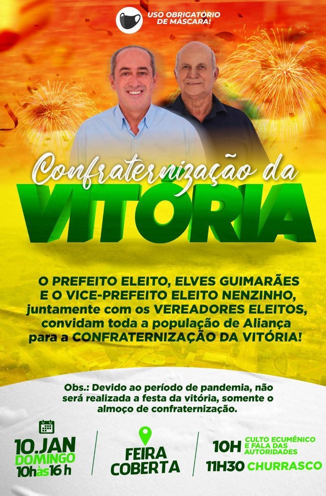 A festa aconteceu no último domingo (10). As autoridades da cidade chegaram a divulgar um convite para a festa nas redes sociais. A imagem mostra a foto do prefeito Elves Guimarães (PTB) e do vice, Nenzinho (PSC) com a seguinte mensagem: “O prefeito eleito, Elves Guimarães, e o vice-prefeito eleito Nenzinho, juntamente com os vereadores eleitos convidam a população de Aliança para a confraternização da vitória.”