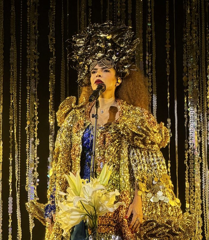 Vanessa da Mata no palco da casa Vivo Rio com o manto dourado com que entra em cena no show ‘Todas elas’