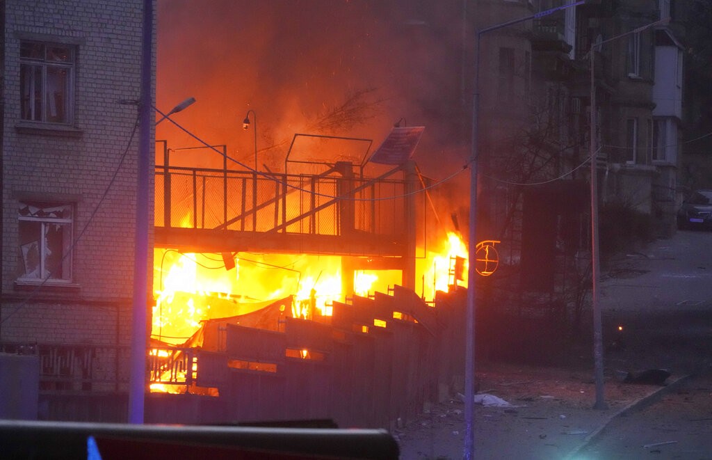 Jornalistas da agência de notícias AFP viram um prédio em chamas, em uma área residencial de Kiev, com uma densa coluna de fumaça preta escapando pelas janelas quebradas.