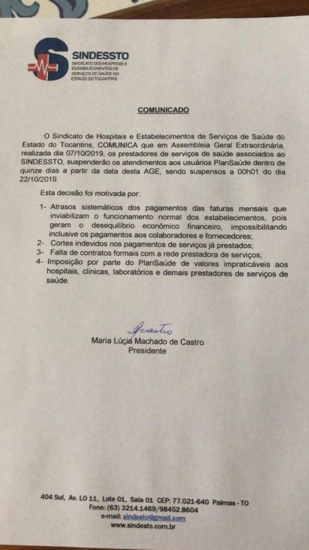 O Sindicato dos Hospitais e Estabelecimentos de Serviços de Saúde no Tocantins (Sindessto) comunicou nesta segunda-feira, 7, a suspensão do atendimento aos usuários do PlanSaúde em todos os estabelecidos associados ao Sindicato, a partir do dia 22 deste mês. O motivo é uma dívida não paga pelo Governo do Tocantins, no valor de R$ 95 milhões.