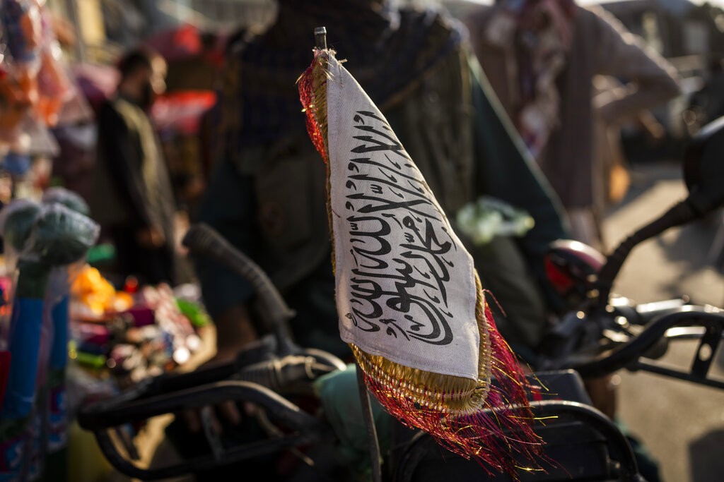 Medida do regime visa combater o uso de dólares americanos, que é comum nos mercados do país. Em áreas de fronteira, como na com o Paquistão, a moeda do país vizinho também é bastante usada. Uma bandeira do Talibã é colocada na frente de uma motocicleta em Cabul, Afeganistão, em foto de 28 de setembro de 2021