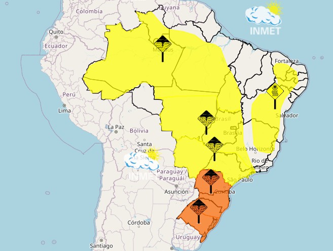 Há risco de corte de energia elétrica, queda de galhos de árvores, alagamentos e descargas elétricas.