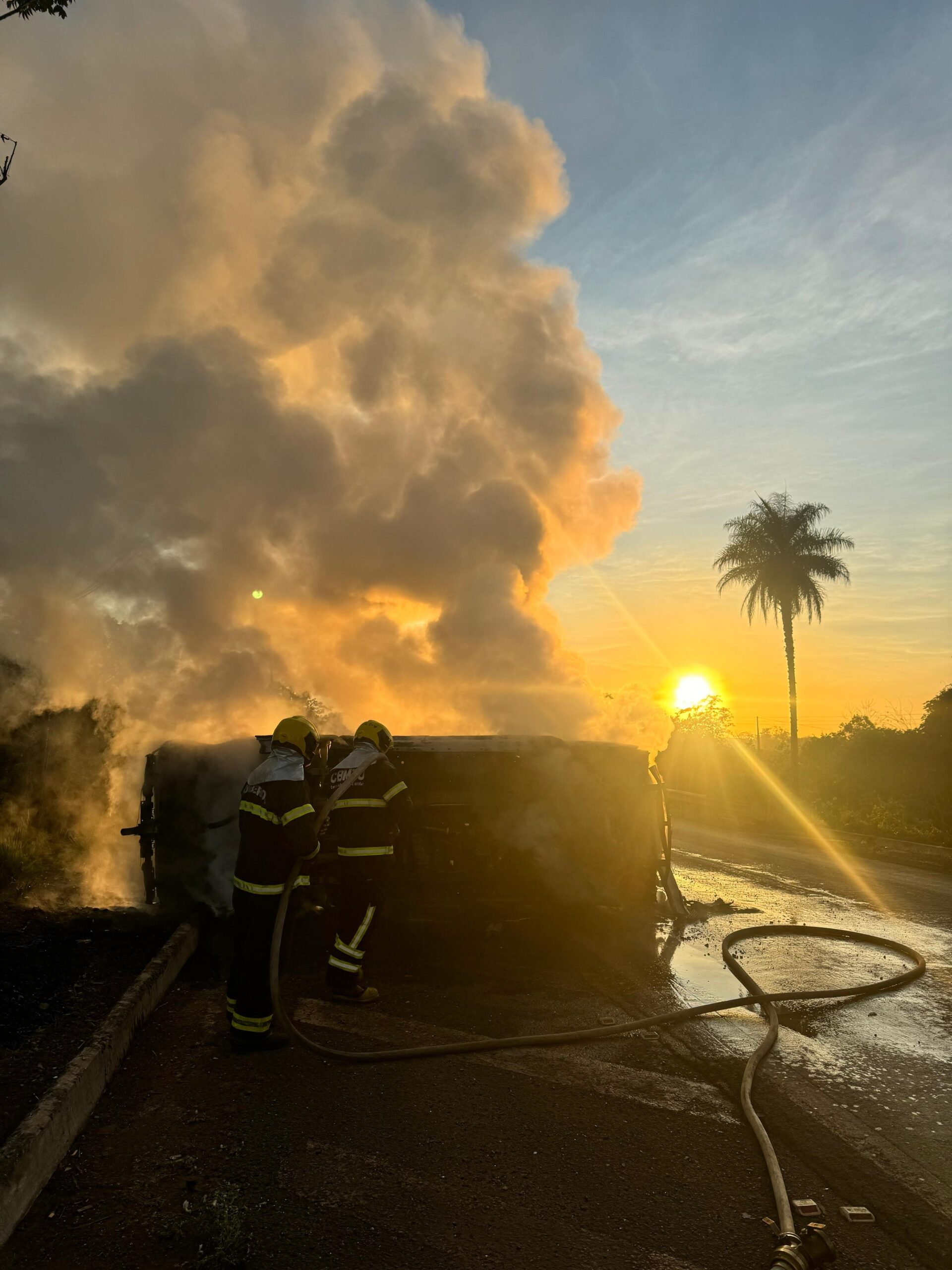 Os bombeiros foram chamados para apagar as chamas do veículo por volta das 6h20. O motorista não estava no local e conforme a Polícia Rodoviária Federal (PRF), ele não foi encontrado.