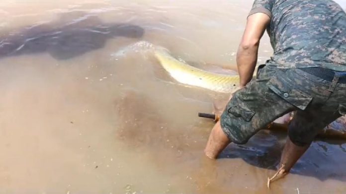 Com muito cuidado, a equipe ainda trabalhou para retirá-lo do veículo e outros dois guardas conseguiram soltar o pirarucu na parte com mais profundidade.