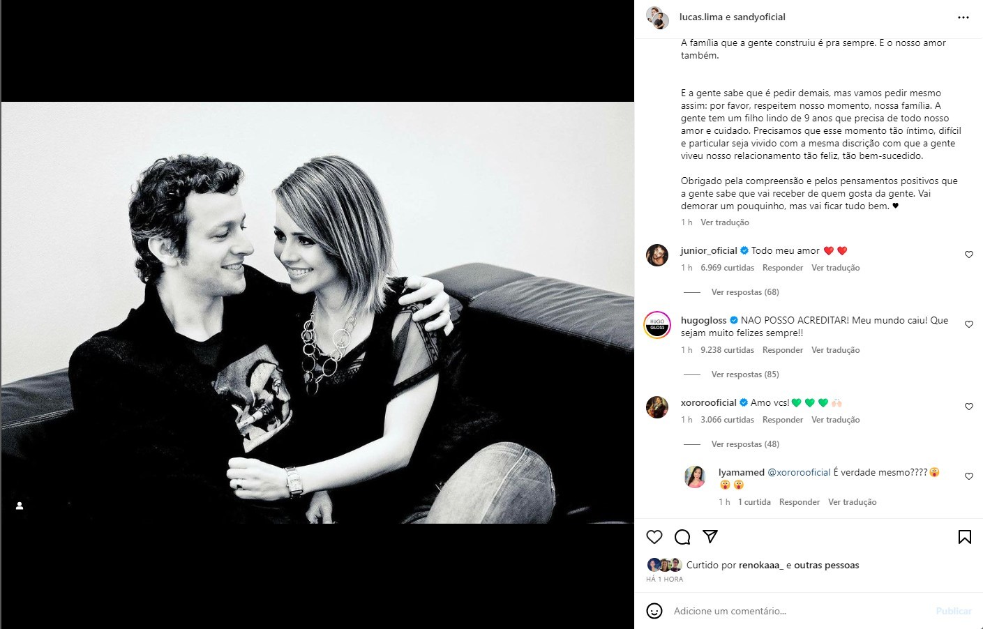 Xororó usou o post de anúncio da separação da filha, Sandy, e Lucas Lima, para deixar uma mensagem ao ex-casal: “Amo vocês”, escreveu o cantor sertanejo, acrescentando três corações ao post.